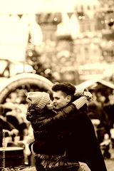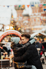 Happy couple on an outdoor Christmas market. Young affectionate couple kissing tenderly on Christmas street.