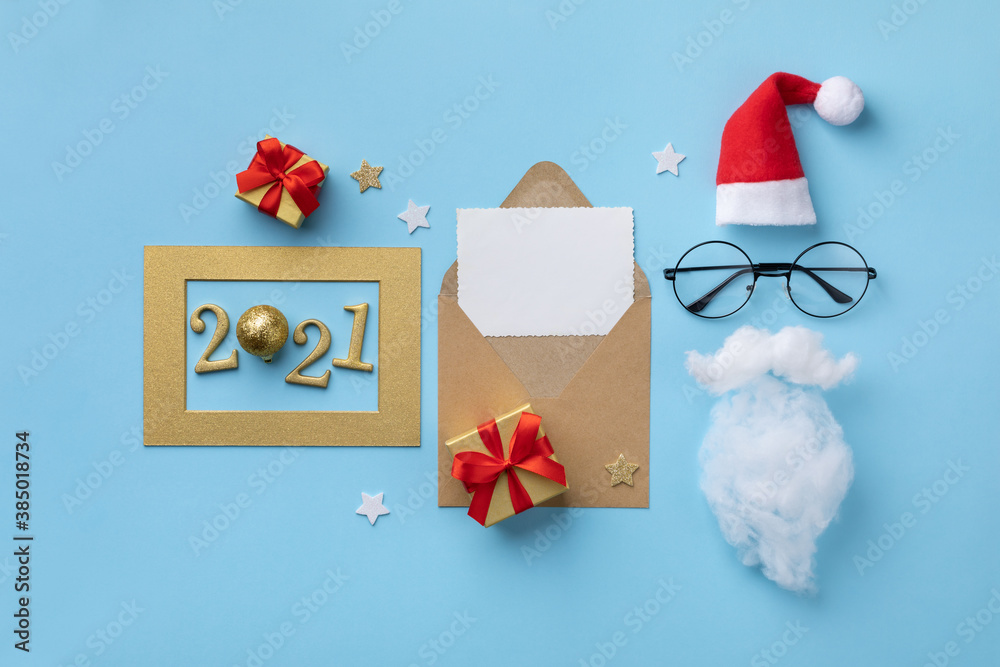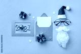 Happy New year 2021 or Christmas greeting card. Santa Claus face with hat, beard, glasses and gift boxes.