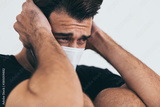 Upset depressed melancholy sad crying guy in protective face mask with crying during serious illness, coronavirus outbreak and flu covid19 epidemic. Stressed guy stay alone at house and get lonely