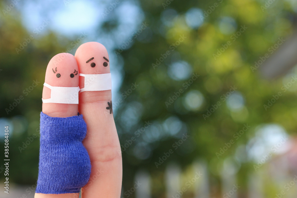Fingers art of couple in medical mask from COVID-2019. Woman is pregnant.