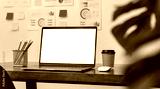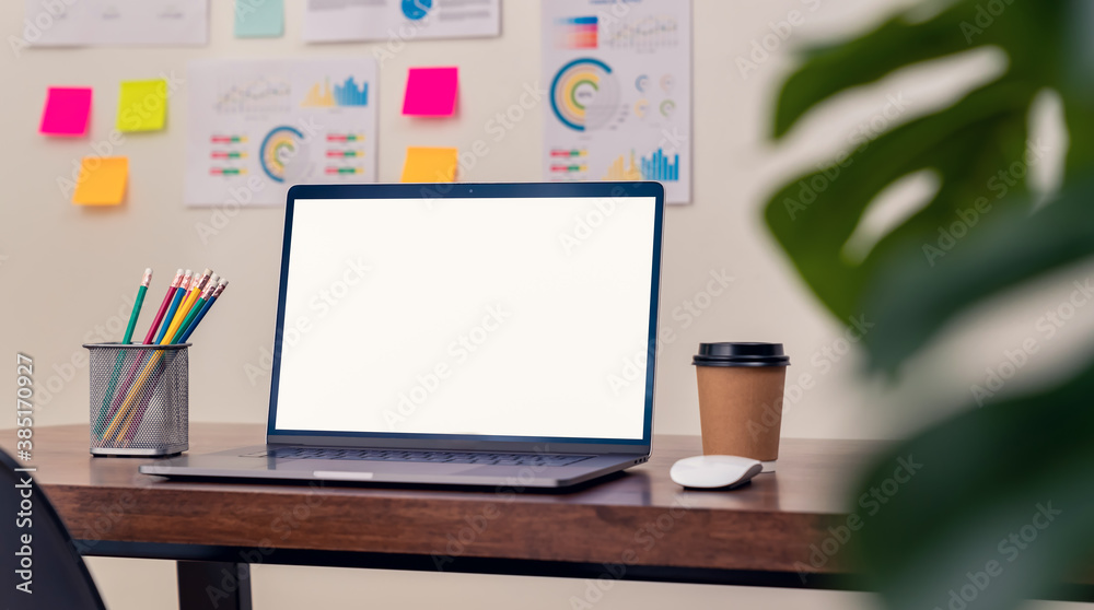 Laptop a blank screen on the table for putting on a computer advertisement. coffee cup and office equipment at desk.