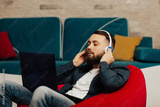 Bearded man wearing headphones enjoying favorite music. Positive young male relaxing on cozy armchair.