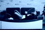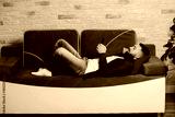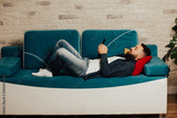 Man relaxing on a lounge and holds cell phone. He text messaging with mobile phone at home.