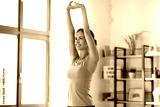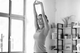 sport, fitness and healthy lifestyle concept - smiling young woman stretching arms at home