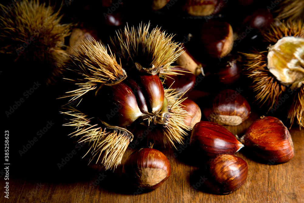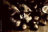 Chestnuts and chestnut burs. European species, sweet chestnut (Castanea sativa)