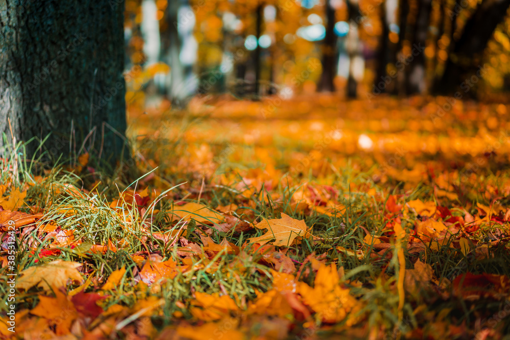 Colorful background image of fallen autumn red and orange leaves perfect for seasonal use.