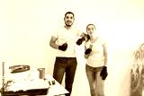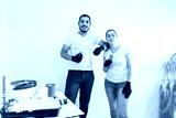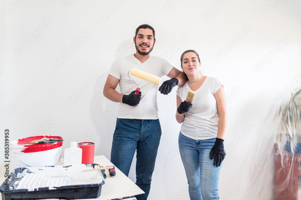 Young couple painting walls, they are posing together and smiling at camera