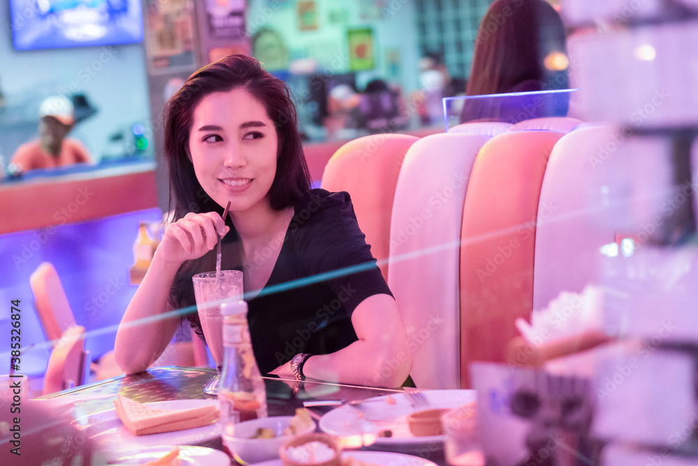 Young beautiful retro girl sitting in a diner restaurant. Woman in black eating in a diner with beautiful neon light. Pretty happy young woman sitting in the diner. Fashion girl in a vintage cafe.