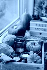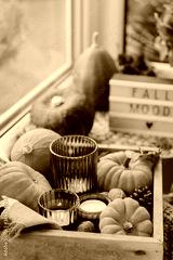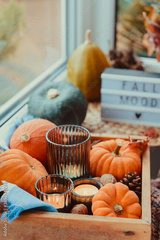 Autumn cozy mood composition on the windowsill. Pumpkins, cones, candles on wooden tray, blurred Fall mood message on lightbox, warm plaid. Autumn, fall, hygge home decor. Selective focus. Copy space.