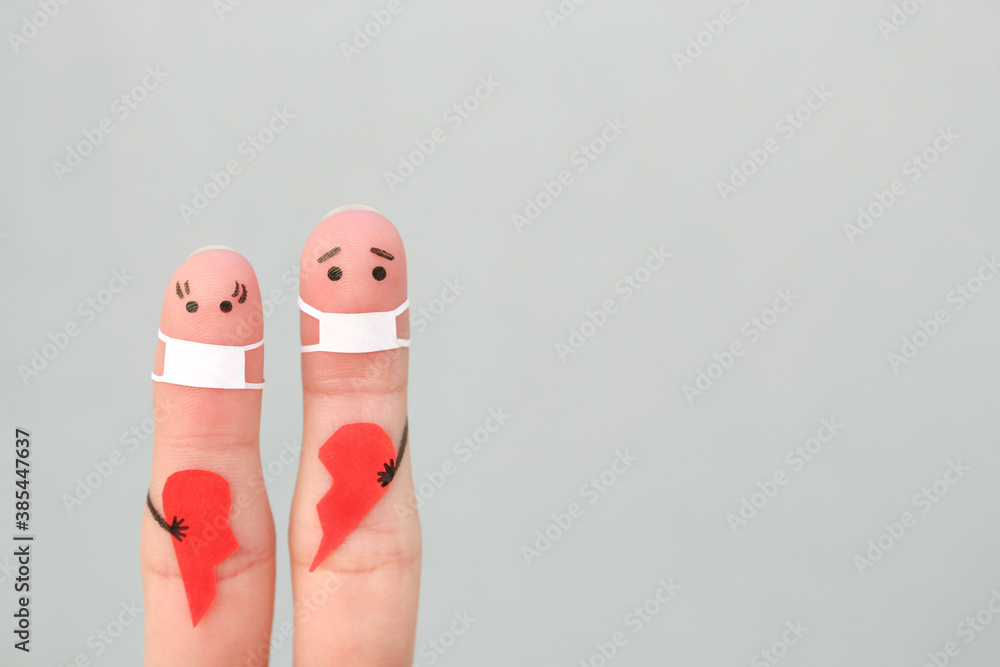 Fingers art of couple in medical mask from COVID-2019. Concept of couple holding broken heart.