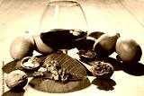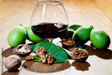 Nocino in the glass- Traditional Italian liqueur made with walnuts.Nuts kernels with shells, fresh walnuts and leaves around on a wooden table — in