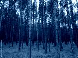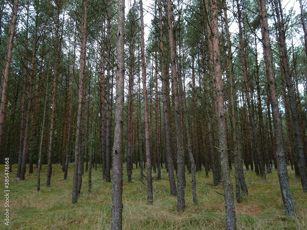 drzewa i trawa w sosnowym lesie w pochmurny dzień