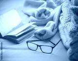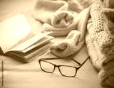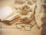 Warm sweaters are stacked against a beige background, along with an open book and black-rimmed glasses. Leisure. The comfort of home.