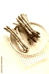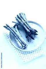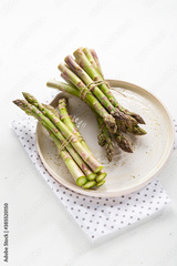 Fresh organic asparagus close up on white plate