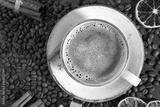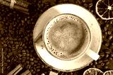 White cup of fragrant coffee on the background of coffee beans, cinnamon