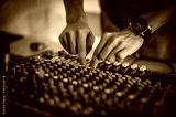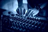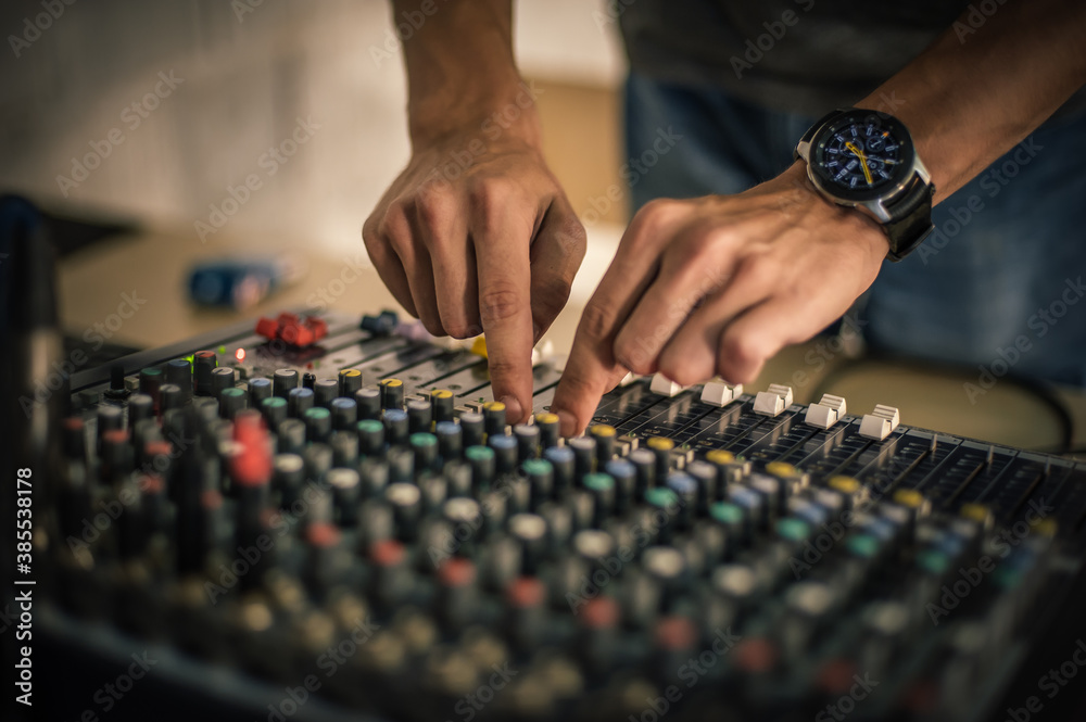 Behind the scene. Sound technician electric engineer adjusting sound elements backstage. Control audio panel. Audio mixing console