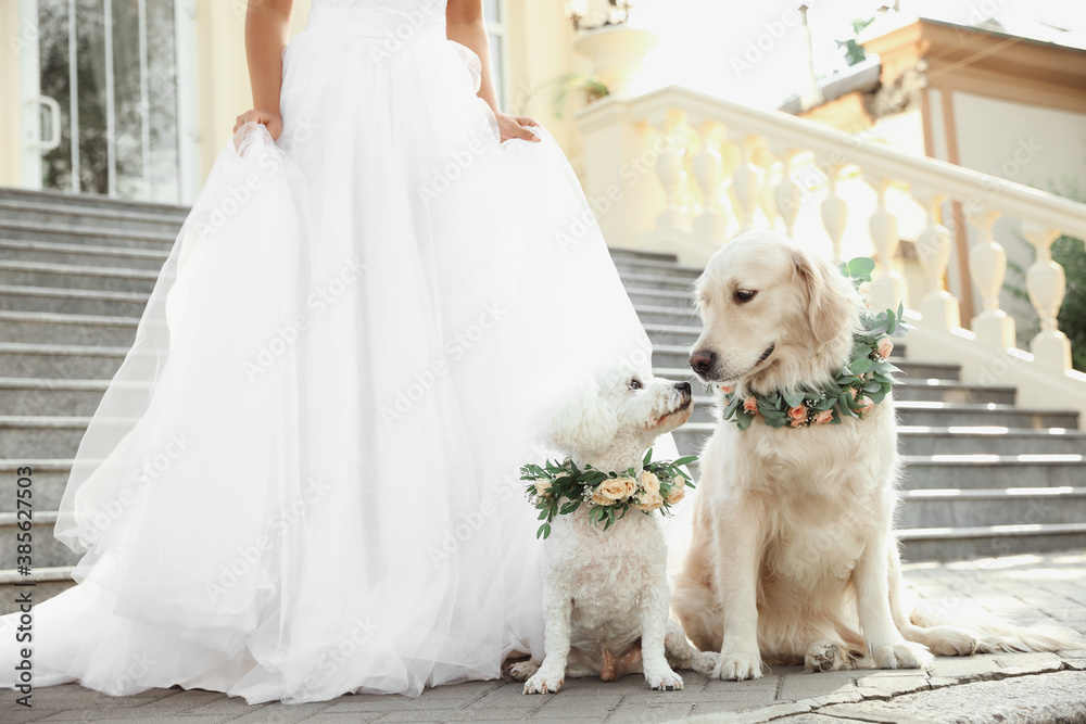 Bride and adorable dogs wearing wreathes made of beautiful flowers outdoors, closeup
