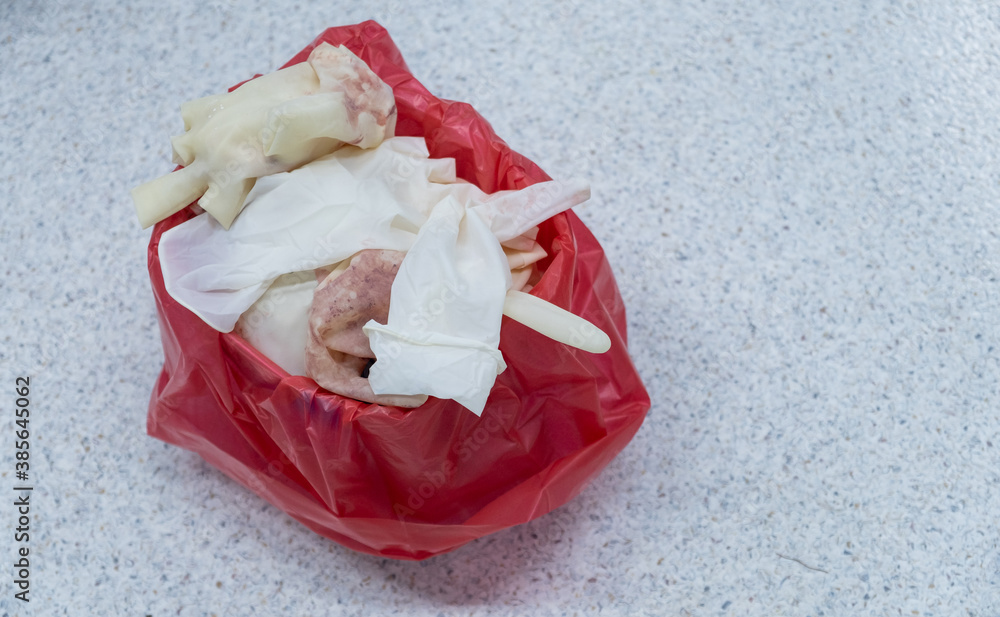 Conceptual shot of medical waste, medical gloves with blood-stained in garbage bin for biohazard disposal.