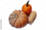 Butternut pumpkin, Halloween pumpkin and Fairytale or Musque de provence pumkin isolated on white background