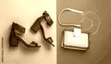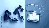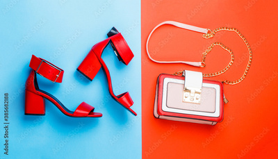 Stylish red women's leather sandals shoes. Woman bag, sandals on red and blue background isolation. Ladies bag and stylish red shoes. High heel women shoes and a bags