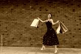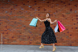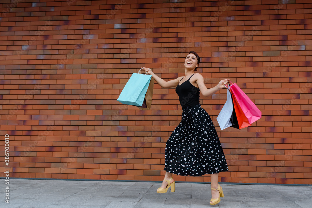 Young happy smiling beautiful woman is jumping and running on the street near a brick wall and holding a lot of shopping bags.