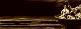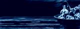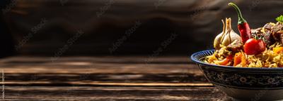 Traditional uzbek meal called pilaf. Rice with meat on plate with oriental ornament on a dark wooden background, Long banner format. space for text