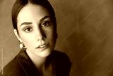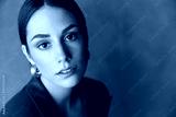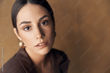 portrait photo of a beautiful stylish girl in a brown suit,on brown background in studio, she mysteriously looks into the camera with her brown eyes