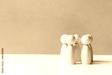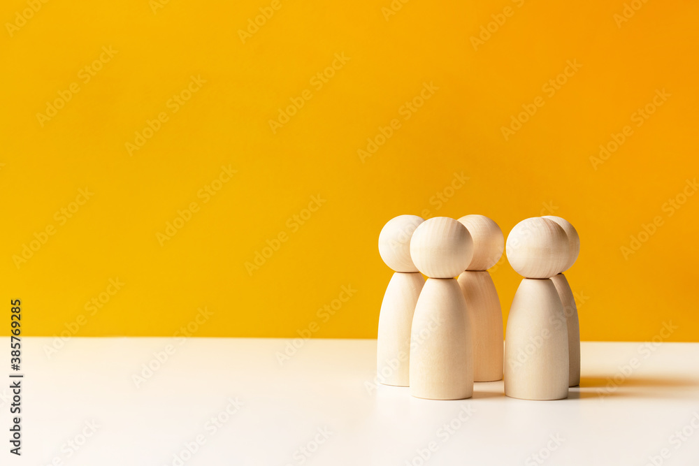 Company of wooden people on a yellow background with letters. The concept of team work and management, copy space
