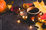 Cup of black coffee, autumn maple leaves and lights on dark background. Cozy autumn seasonal background.