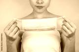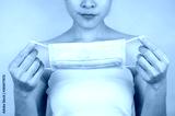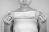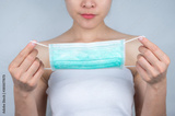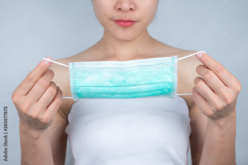 Someone holding a surgical mask before wearing. A surgical mask is a fitting disposable mask that protects the wearer's nose and mouth from contact with droplets.