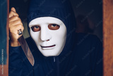 An unidentified man with a sharp knife hiding behind the door, waiting for his victim. Conceptual of a person who commits a crime.