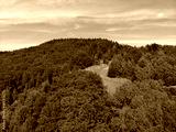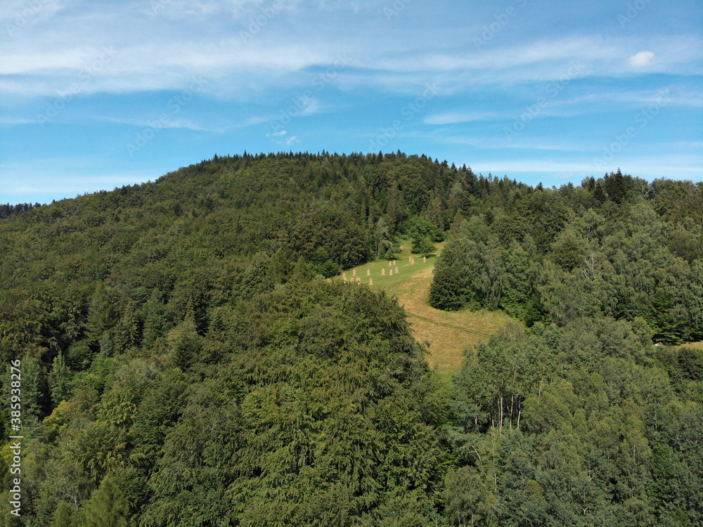 Haystacks on mountain hill in summer. Beskid Sadecki, Poland.
