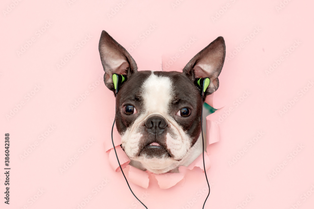 The head of a Boston Terrier with fashionable headphones stuck in its ears looks through a hole in the pink paper. musical, creative. Minimalism. Creative art.
