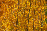 Close-up view of golden yellow and orange aspen trees and leaves on a sunny day