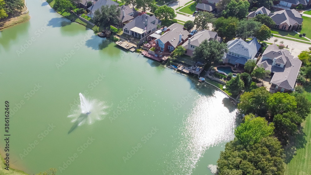 Aerial view luxury waterfront houses with lake fountain in sunny day near Dallas, Texas, USA