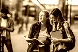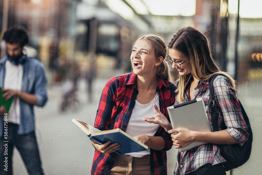Happy young university students friends studying with books and digital tablet at university