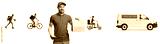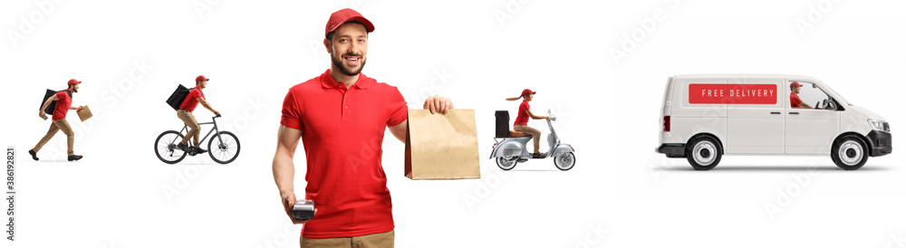 Courier with a paper bag and other workers with delivery van in the back