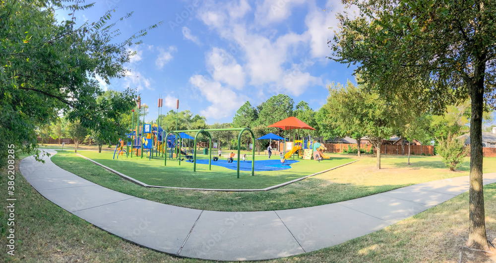 Panoramic view neighborhood playground with sun shade sails, artificial grass in Flower Mound, Texas, America