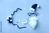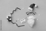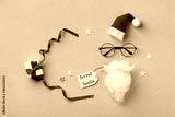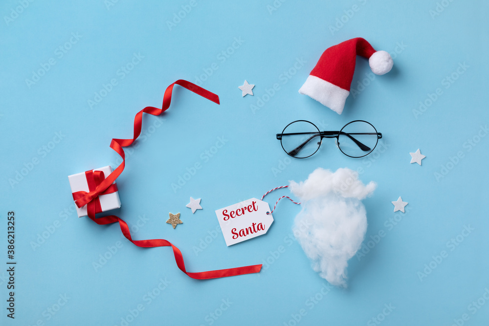 Christmas present or gift for Secret Santa with Santa hat, glasses and beard on blue background.