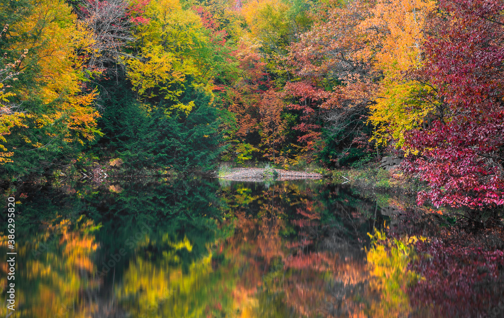Colorful autumn trees by small lake with its reflections in the lake during autumn time.