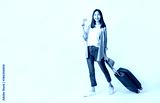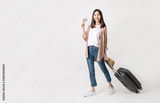 Young smiling woman dragging a suitcase with a brown hat and showing her credit card on a white background. for advertising.