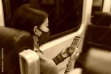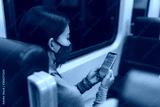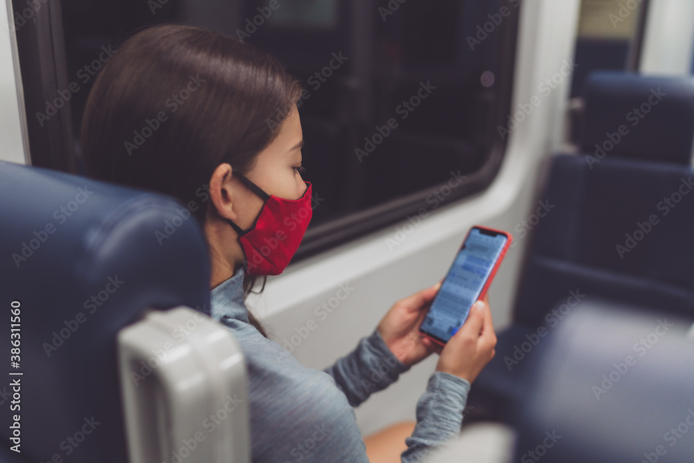 Train commute during corona virus pandemic. Woman passenger using mobile phone wearing face mask sitting in public transport texting online on contact tracing app.