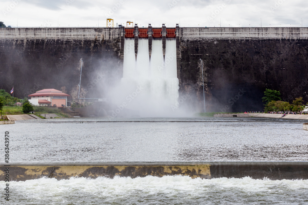 Water flowing over floodgates of a dam at Khun Dan Prakan Chon, Nakhon Nayok Province, Thailand