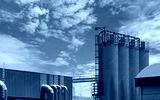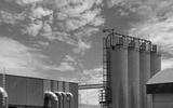 Agricultural silo at feed mill factory. Big tank for store grain in feed manufacturing. Seed stock tower for animal feed production. Commercial feed for livestock, swine and fish industries.