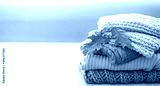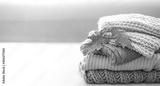 Stack of warm knitted items from autumn wardrobe close up on blurred white background.