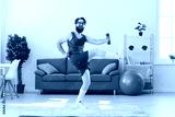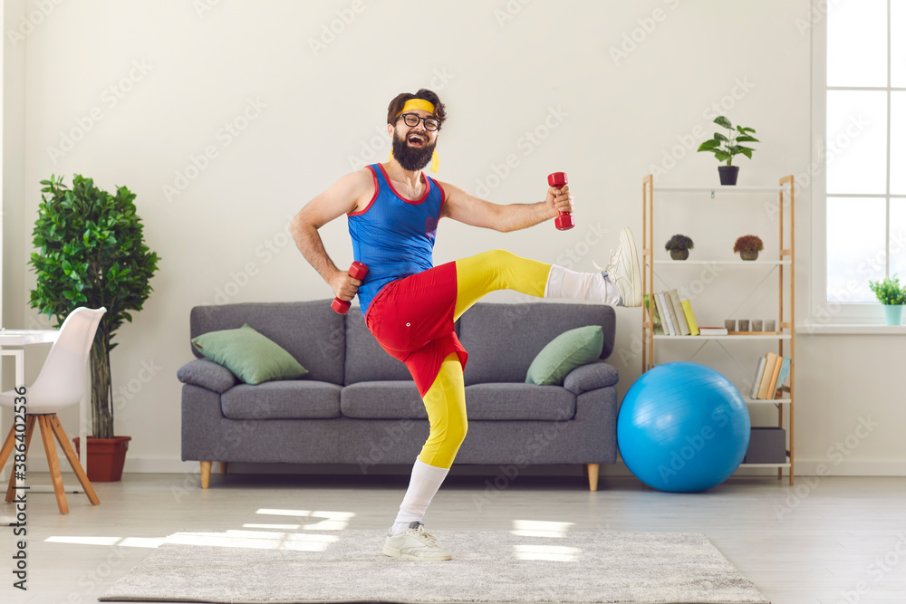 Happy funny young man in retro activewear exercising with dumbbells and laughing