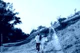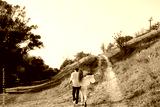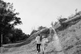 Romantic couple travel, spend summer vacation together in the countryside outdoors. Back view.