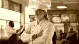 Portrait of happy mature chef in uniform standing in modern bistro restaurant