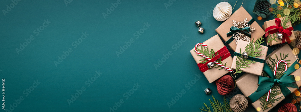 Banner with many gift boxes tied velvet ribbons and paper decorations on turquoise background. Christmas background.