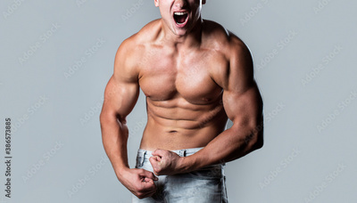 Muscular bodybuilder posing over white background. Muscular man screaming. Screaming man with well trained body, biceps, abs and pecs and wearing. Muscular male strains muscles and screams